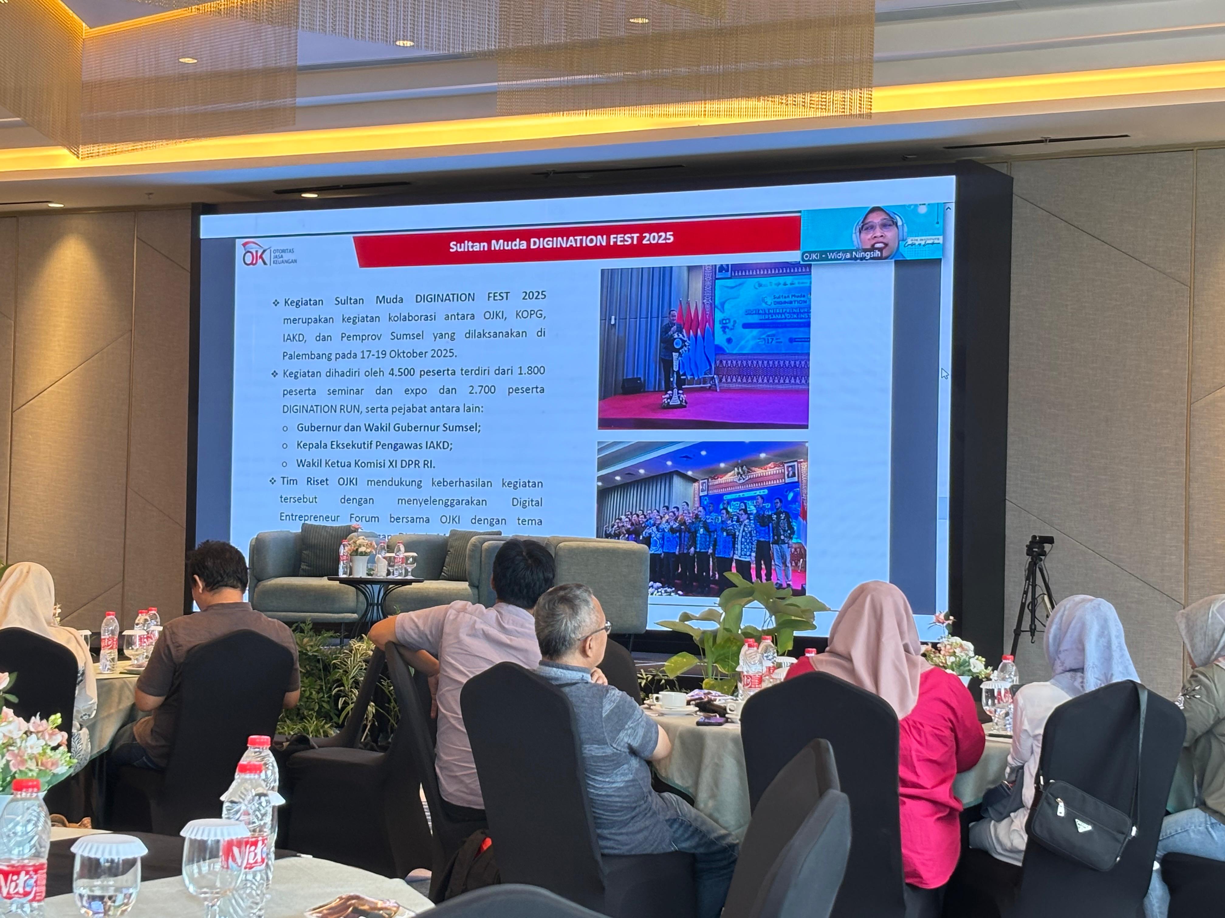 Narasumber pertama, Widya Ningsih Asisten Direktur OJK Institute (OJKI) memaparkan bagaimana arah riset OJK pada 2025 difokuskan untuk memperkuat industri jasa keuangan secara sehat dan efisien.